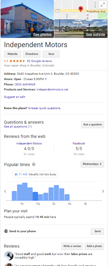 As long as your local business meets Google’s guidelines, your Google My Business profile can help give your company FREE exposure on Google’s search engine. Not only can potential customers quickly see your business’ name, address and phone number, but they can also see photos of your business, read online reviews, find a description about your company, complete a transaction (like book an appointment) and see other information that grabs a searcher’s attention — all without them even visiting your website. That’s pretty powerful stuff!