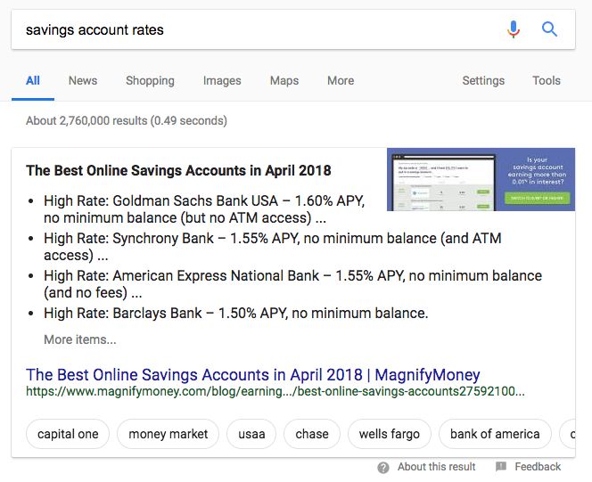 So, if you searched [savings account rates] and clicked the “capital one” IQ-bubble, you’d be looking at a snippet for “savings account rates capital one.” That said, 72.06 percent of the time, natural language processing will step in here and produce something more sensible, like “… Read More