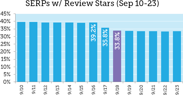The purple bar shows the new “normal” in our data set (so far). This represents a two-day relative drop of nearly 14% (13.8%). It definitely appears that Google dropped review snippets from page-1 SERPs across the roughly 48-hour period around their announcement (note that measurements are only taken once per day, so we can’t pinpoint changes beyond 24-hour periods).