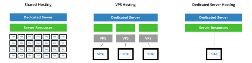 Here’s a visual representation that shows the difference between shared hosting, VPS hosting, and dedicated servers.